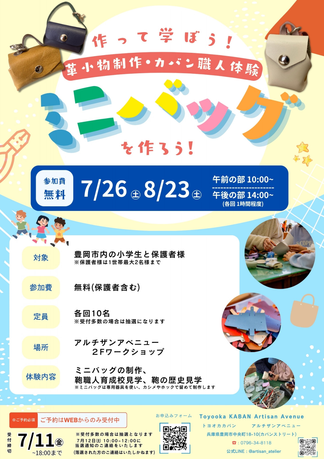 当施設では、地域の子どもたちに地場産業である「鞄」を身近に感じていただきたく、春休みに引き続き、豊岡市内の小学生のお子様を対象にミニバッグ製作の体験ワークショップを開催します。参加申し込みは事前予約制とさせていただき、応募多数の場合は誠に恐れ入りますが抽選での選考といたします。何卒ご了承ください。