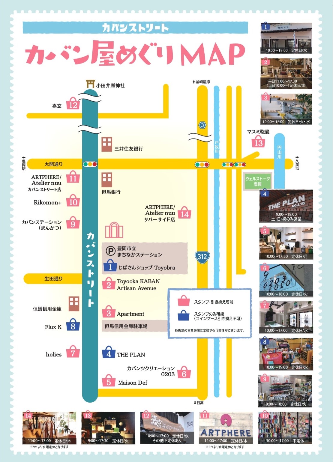 兵庫県豊岡市の ”カバンストリート” にて、スタンプラリー「カバン屋めぐり」を 8月21日(木)より開催します。ストリート周辺の参加店を巡り、スタンプを5つ集めていただくと、カバンストリートのロゴ入り「レザーコインケース」をプレゼントいたします。当施設「Toyooka KABAN Artisan Avenue」も参加店です。スタンプラリーをぜひお楽しみください。