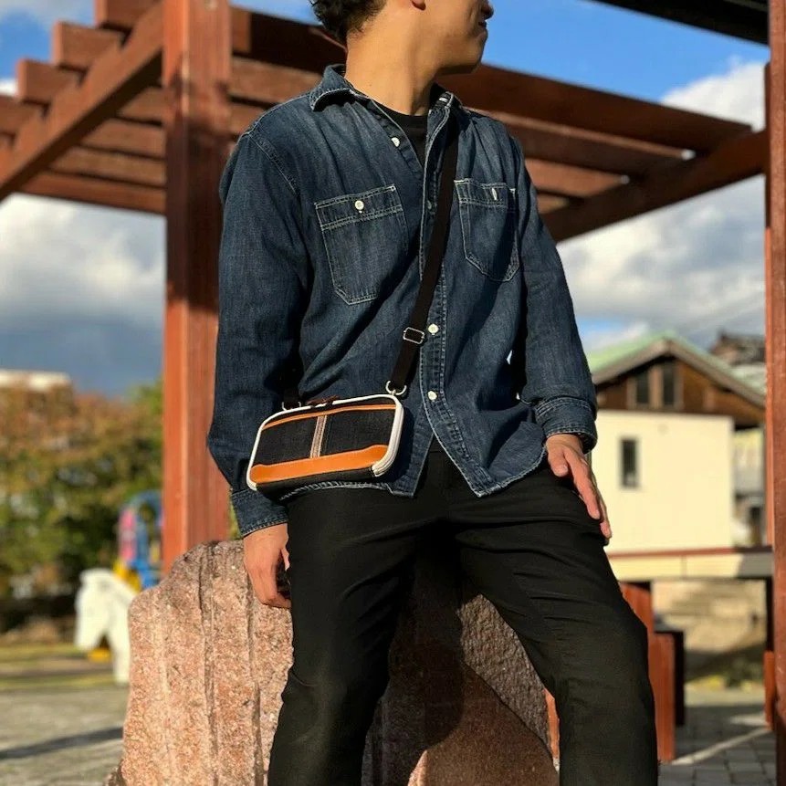 当施設3Fの職人育成専門校「Artisan School」生徒が在学中に企画したデザイン案が、豊岡鞄として商品化された先駆けの鞄。必要最小限の携帯品を身軽に。合わせやすいデニムでお出かけにも◎